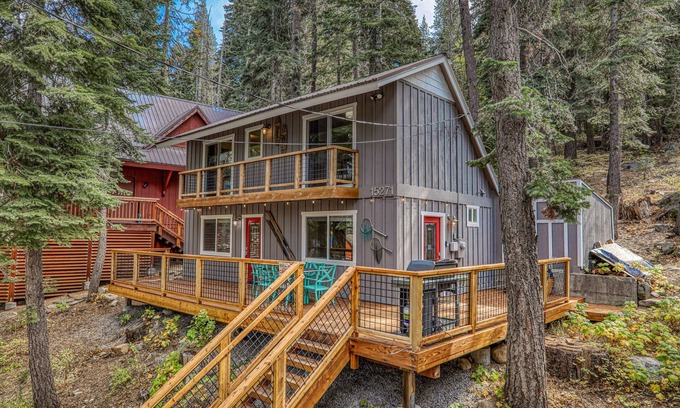 This is a cute and cozy renovated cabin on the west end of Donner Lake, with parking for 2 vehicles. Walking distance to the West End Beach as well as the Donner Lake PUB. It has a filtered lake view. You enter the cabin either by the kitchen or the living room. The kitchen features a gas stainless steel range, dishwasher and refrigerator. There is a dining table with seating for 4. Right off of the kitchen is the living room. Set the right ambiance on chilly Donner nights with the gas burning stove while you watch your favorite show on the flat screen TV. The full bath is located downstairs where you will also find a full washer/dryer. Up the stairs is where you find the 2 bedrooms. The master bedroom features a queen size bed with a sliding glass door to access the outside balcony. The second bedroom has 2 separate twin beds. There is a large deck off the front of the house to enjoy BBQing with the family while watching the little ones play in the front yard.