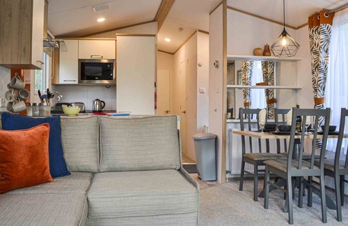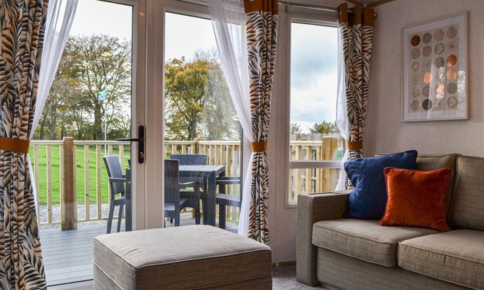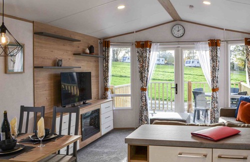 Shower Room: Cubicle Shower, Heated Towel Rail, Toilet. Gas central heating, gas, electricity, bed linen, towels and Wi-Fi included. . Enclosed rear garden with decked area, sitting-out area, BBQ and firepit. 23-acre grounds (shared with other properties on-site). Hot tub for 4 (private). Private parking for 1 car. Electric vehicle charging point on site. No smoking. Please note: There is an unfenced stream in the grounds.. This beautiful two-bedroom holiday home is situated on a quiet park and has a private hot tub on the decking. Perfect for a memorable stay for couples and families, this detached property is situated on the on the ever popular, Wallace Lane Farm. Located north of the Lake District National Park, it provides an excellent base for your next Cumbrian getaway. This stunning holiday home features the latest in design and contemporary holiday home specification. The attention to detail is second to none. The open plan living room, dining room and kitchen comes well equipped with everything you need for a comfortable and relaxing stay. With a gas hob, oven and microwave you can cook up a feast after a day of adventure then relax on the comfortable sofas in front of the TV. The main bedroom features a double bed, TV and storage for your belongings and an en-suite toilet. The second bedroom has twin beds, and there is also a shower room. Outside you’ll find decking and an outdoor seating area to soak up the sunshine and it makes the perfect spot for your morning coffee or a nice glass of chilled wine before taking a dip in the hot tub.