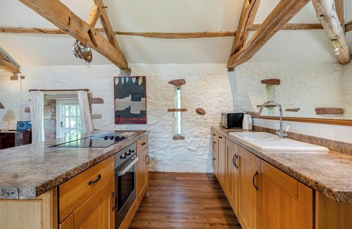 Stepping inside, the ground floor greets you with a practical utility room and toilet– perfect for muddy boots and paws after a day exploring the stunning surroundings. Upstairs is the main living area, where you’ll find an inviting open-plan living, dining, and kitchen space that is both stylish and homely. Vaulted ceilings, exposed wooden beams, and rustic brickwork create a wonderful sense of space and history, while the crackling wood-burning stove promises cosy evenings. Whether you’re gathered around the dining table for a family feast or curling up with a good book by the fire, this room is designed to bring loved ones together in comfort. The Hayloft boasts two beautifully appointed bedrooms, offering a peaceful sanctuary after a day’s adventures. The super king bedroom features a luxurious en-suite with a double shower, while the twin room benefits from a Jack and Jill bathroom with a shower over the bath – perfect for families or couples alike. Step outside to discover an enchanting walled garden, where you the owners allow you to pick their excess vegetables and fruit in season. Relax in the peace of this space with a morning cup of tea or a sunset glass of wine.
