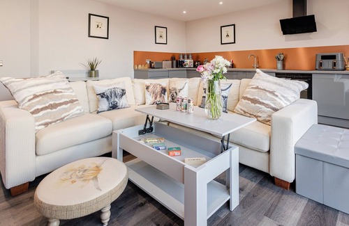 Shower Room: Double Shower, Toilet. Biomass central heating, electricity, bed linen, towels and Wi-Fi included. Cot and highchair. Welcome pack. Enclosed rear lawned garden with patio, large decked area, garden furniture and electric barbecue. Hot tub for 4 (private). Bike store. Electric car charging point. Private parking for 3 cars. No smoking.. As you step into this haven of serenity, you are greeted by an open-plan living space adorned with tasteful furnishings and large windows that invite natural light to dance across the room. Sink into plush sofas in the open-plan area, perfect for cosy evenings with loved ones. The fully-equipped kitchen beckons culinary adventures, complete with modern appliances and ample counter space for preparing delicious meals.