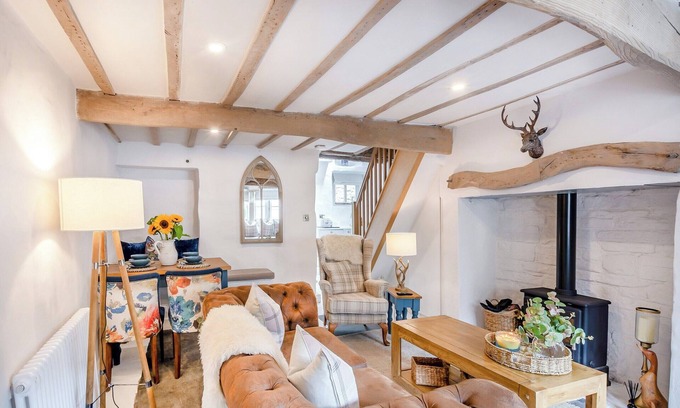 Bathroom: Bath With Shower Over, Heated Towel Rail, Toilet. Heating, electricity, bed linen, towels, Wi-Fi included. Initial logs for wood burner included. Welcome pack. Patio area with garden furniture. 1 small dog welcome, to be kept on a lead at all times (due to shared access area). On road parking. No smoking. No children under 8 years old.. Nestled in a serene countryside setting, this quirky property boasts exposed stone walls and beams that exude character and warmth. Please note being an old cottage, the property has low and high ceilings throughout.