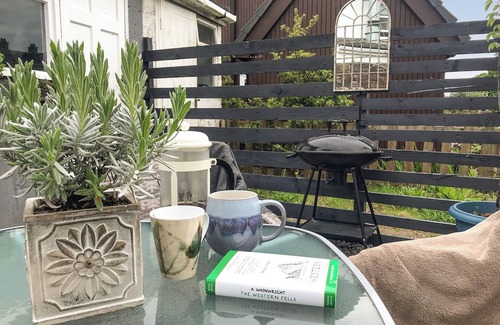 The owners have a great eye for detail and guest experience is high on the list of priorities. On the second floor you’ll find a twin bedroom with pleasant views. On the first floor you’ll find the master bedroom with double bed, plenty of storage and pleasant views. The bathroom comes with a bath and shower, there’s also a quiet snug which is ideal to relax and read. On the ground floor, you have an open plan living and dining room with comfortable sofas, open fire, easy seating and Smart TV, ideal for a cosy night in by the fire after a day of adventure. The compact kitchen is well-equipped and leads to the rear garden with outdoor seating. There’s also a small outbuilding with washing machine.