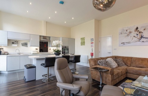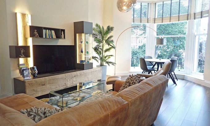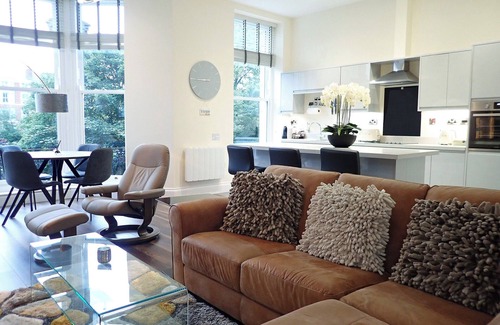 Bathroom: Bath With Shower Over, Heated Towel Rail, Toilet. Electric central heating, electricity, bed linen, towels and superfast fibre broadband included. Welcome pack.. On road parking (disc for 1 car provided for 3 hours, no return within 1 hour, free 6pm-9am); additional scratch card provided for parking in certain zones around Scarborough. No smoking. Please note: Sorry, no hen or stag parties. No children under 10 years old.. The Haven is a beautifully presented two bedroom apartment providing stylish accommodation on the desirable South Cliff area in Scarborough. Just minutes from the beach, this first floor apartment is open plan, with the kitchen, dining and living area forming one large spacious room. This luxury property is equipped with exceptional facilities, including an OLED TV with directional acoustic screen and Netflix in the living area, and luxury mattresses and pillows in both bedrooms. Overlooking one of Scarborough’s prestige garden squares, and with side sea views, this accommodation sits amid a row of elegant Victorian houses. The apartment is presented to a high specification with fine furnishings and contemporary design. Within walking distance there are restaurants, wine bars, pubs and shops as well as the Italian Gardens. The apartment is just around the corner from a hotel where you can relax in the spa, use the gym or have a swim (payable to the hotel). From the apartment you can walk down to the beach or catch the cliff tram, the first funicular railway, built in the UK in 1865.