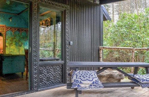 Bathroom: Roll Top Bath With Shower Over, Toilet. LPG central heating, gas, electricity, bed linen and towels. Welcome pack. . Front garden with BBQ and garden furniture. Grounds (shared with other properties on-site). Private parking for 2 cars. No smoking. Please note: There are 2 steps in the garden.. Queens Mab’s is one of two truly unique bothies surrounded by over two hundred acres of woodland at Jollydays, on the edge of Stamford Bridge, a thriving village just a short drive from the historic city of York. With dramatic hand painted interiors, a covered veranda and large wood burner this lodge is perfect for couples or a small family looking for seclusion and a little time to live in the woods! Take the private pathway and find Queen Mab’s surrounded by mature woodland. A large, covered veranda with seating and barbecue offers the perfect place for al-fresco dining whilst watching the wildlife that surrounds this holiday home. Listen to the woodpeckers, marvel at the soaring buzzards, or spot the deer and badgers.