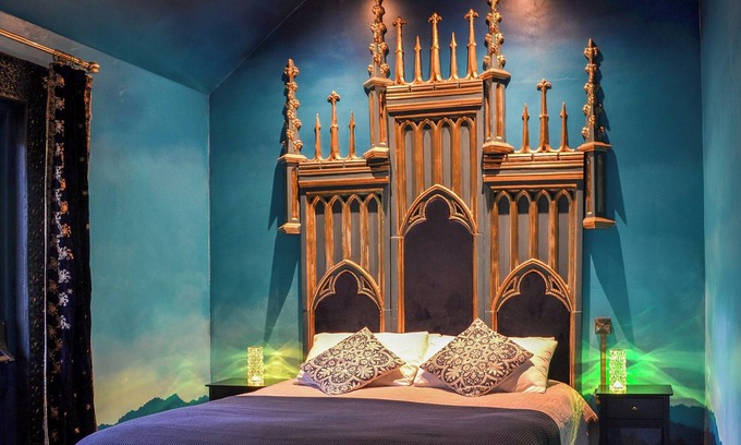 Step inside and step back in time to an era of myths and legends. Take a while to marvel at the stunning interior, hand painted by the owners. The open plan living area is well planned with a small kitchen. Cook inside or enjoy a meal out at one of the many eateries in the area – the choice is yours. The dining table is close by where you can enjoy a hearty breakfast before heading out for the day. Deep filled sofas and a window seat are ideally placed to enjoy a theatrical evening in front of the wood burner. The bathroom is simply stunning! Generous in size and with a roll top bath with shower over. Relax and unwind surrounded by nymphs and fairies after a long day exploring. Two dramatic zip and link bedrooms provide a magical ambiance for a relaxing night’s sleep.