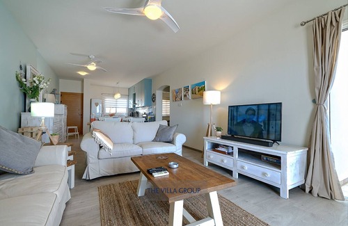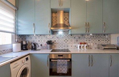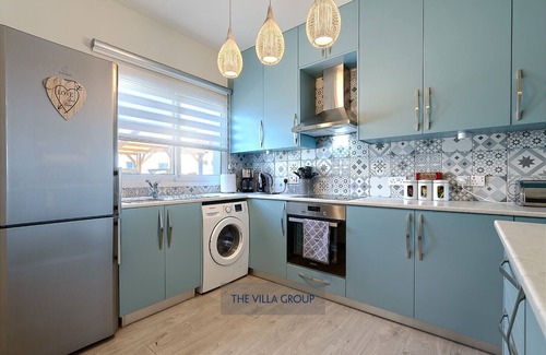 The apartment's open-plan kitchen, dining and living areas are furnished to a high standard with modern furnishings. The kitchen with an island offers all necessary appliances, including fridge/freezer, oven, hob, washing machine and microwave. The adjacent dining area seats 4 and the living area has comfortable sofas and IPTV with soundbar is available featuring many English-speaking channels including Netflix. Wireless internet connection is also available. Patio doors from the living area lead to the outside terrace and sunroom.