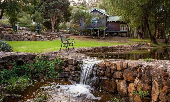 As you drive into the forest-meets-ocean town of Margaret River you may not even realise that, hidden in the tall trees to your right, are rustic wooden cabins, rolling green lawns, and a bubbling winter brook.