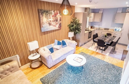 Welcome to your stylish Sheffield stay! This beautifully designed 2-bedroom apartment is set in a prime central location — the perfect spot for professionals, city explorers, or weekend guests looking to enjoy the best of Sheffield in comfort and style. From the moment you walk in, the apartment impresses with its modern layout, warm wooden textures, and plush seating area ideal for relaxing after a busy day.