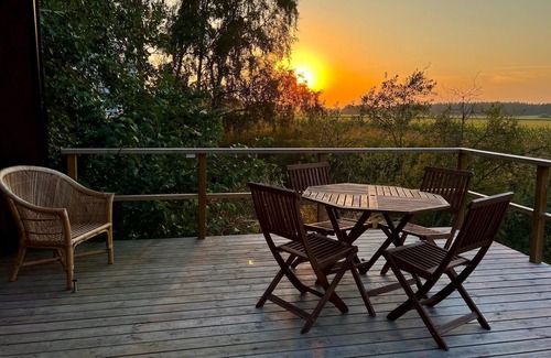 Step out onto the spacious terrace, enjoy the fantastic panorama and relax to the sound of birdsong and the rustling of the trees as you gaze out over the enchanting landscape of Öland. In spring and autumn you can watch large flocks of cranes and geese gather in the fields.