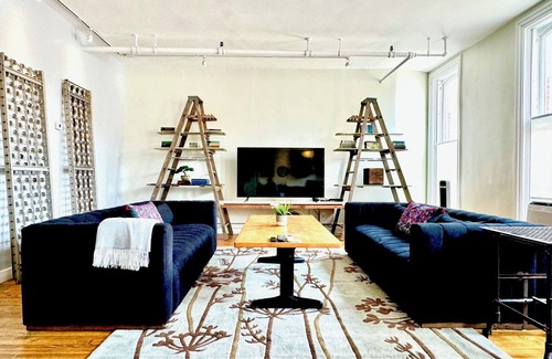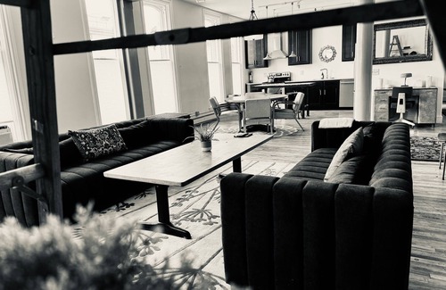 1400-square foot upper floor loft apartment located in a historic building serviced by elevator in the middle of Downtown Medina. Tall ceilings, gleaming vintage wood floors, and huge windows will great you as you enter the open-format living space. Industrial design cues throughout remind of the buildings use as a factory. The living area can seat 8 comfortably and opens onto the dining area and kitchen with quartz counters and stainless steel appliances. Down a hallway is the main full bath featuring soaking tub and oversized tiled shower with rainfall showerhead. At end of hall are two private bedrooms, one with a king bed, and the other a queen.