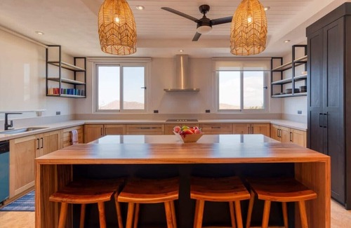 The apartment is located in Pacific Heights, a mountainside community accessible via a gravel road from downtown Potrero. This neighborhood is known for panoramic views of the Pacific Ocean below, and Isla en el Cielo is almost at the top of the mountain.