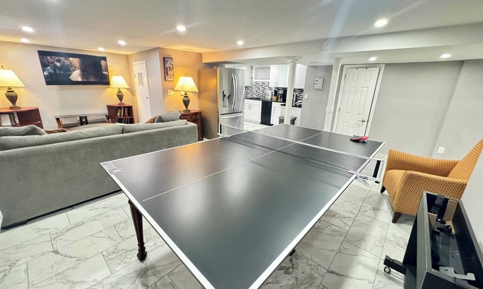 Welcome to this lovely newly renovated basement apartment in the Forest Hills section of Newark w/ free parking! We are in the heart of entertainment nearby to The Prudential Center, MetLife, NJPAC, NYC and Newark Airport. This delightful space features 2 cozy bedrooms with a queen and full size bed, perfect for a peaceful night's sleep. Enjoy the convenience of amenities like filtered water dispensing refrigerator with ice maker, microwave oven, dishwasher, WiFi, and a big washing machine and dryer right inside the apartment. Our kitchen is fully stocked for everything you need to make a nice meal for the family, dining table for 6. Don’t feel like cooking? Order from one of the many great restaurants nearby! Our living room offers additional space with a full sized ping pong table for your enjoyment and a comfy sofa bed for extra guests. Make your holiday one for the books with a stay at our place.