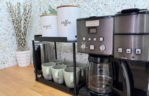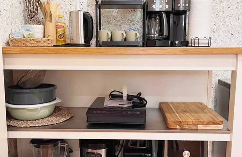 2 bedrooms and 1 bathroom are upstairs. Cozy living room with dining table for 4 and a kitchenette with dishwasher. There is no traditional stove but you are provided with most of the basic appliances you will need for your stay including an electric hot plate.
