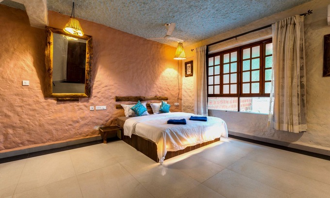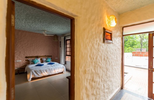 Both the bedrooms are large, spacious and comfortable, with a king size bed and a thick mattress. Both the bedrooms are air conditioned. The bedroom on the upper floor has a small open terrace to relax and enjoy the serene surroundings. The bathrooms are large and luxurious. Each bathroom has a shower cubicle with a glass partition. Villa have a small kitchenette equipped with amenities like an induction cook top, cutlery and crockery. Villa has an attached private pool and a barbeque stand.