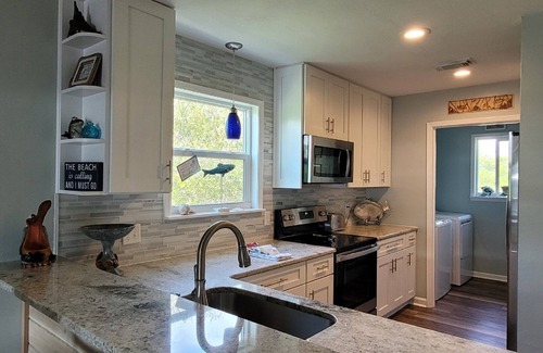 Sunny Dayz is a completely remodeled, 2 bedroom gulf view duplex centrally located on Cape San Blas near Scallop Cove store/deli and San Flea rental store. The home was designed to be fun and colorful downstairs and peaceful and relaxing upstairs. A new covered outdoor space was added summer 2023 with patio furniture and sun catchers to add more living space and coastal vibe even during a rain shower. For more added living space, the picnic table is now downstairs so families may enjoy grilling and eating downstairs in the shade. (There are plastic dishes, cups and pitcher in the kitchen for outside entertaining). The entire home has vinyl plank flooring with carpeted stairs. The kitchen has stainless steel appliances, white cabinets, granite counter tops and lovely glass tile and lighting. Summer 2023 the owners restocked the kitchen by adding more pots and pans, bowls, steam-less wine glasses and everything a "family of four" or "two couples" will need to enjoy their vacay.