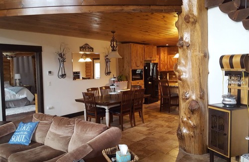 The cabin is perfect place to relax and regain the peace you seek. This beautiful custom cabin has many custom woodsy features. The Log accents, sweeping log stairs and tile work are truly wonderful. The cabin is very cozy and inviting. Relax in the beautiful new claw foot bath tub after a day of playing in the sunshine. The kitchen is a chefs dream with a new gas stove and so many amenities. There is a large comfortable patio out back and an outdoor fire pit for you to roast hotdogs and marshmallows. In the winter time, there are miles and miles of snow mobile trails - so many things to do are just waiting for you. The Mountains are calling! See you soon!