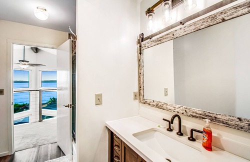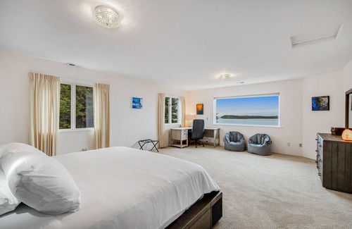 Upon entering, you will come across high ceilings, gorgeous wooden accents, and many large windows letting in plenty of natural light. Kick back and unwind with your loved ones in the living room, which has been furnished with a large and comfortable sectional and a smart TV. This is the perfect spot for movie nights and binge-watching your favorite series thanks to the high-speed internet with speeds up to 500 Mbps. You will have easy access to the deck from the living room and dining area. The deck offers unobstructed water views and a great place to enjoy the breeze. Between the living room and the kitchen/dining area is a nice viewing point furnished with two rocking chairs and a coffee table directly overlooking the water. The kitchen is fully equipped with modern, stainless steel appliances that will make cooking a breeze no matter what. This idyllic home offers a private outdoor hot tub. The second floor of this home features two comfortable bedrooms and an office-like room with a desk with majestic views of the water. This property also features a separate apartment with a well-appointed living room with a TV and water views, a deck with an outdoor dining area and a gas grill, a well-equipped kitchen with all the essentials, two more bedrooms, and two full bathrooms.