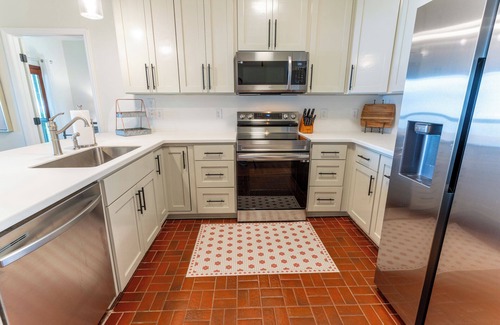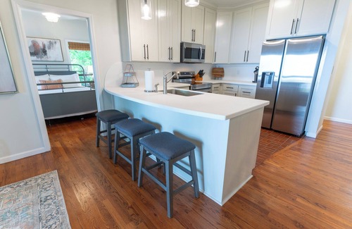 The well-equipped kitchen features new kitchen cabinets, countertops and stainless-steel appliances and bar seating for 3. The cozy dining table seats 4.