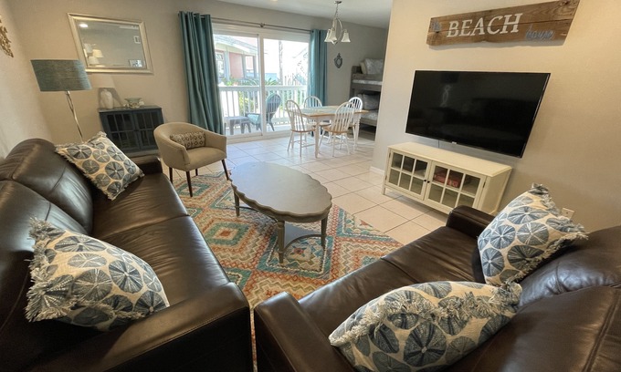 Newly refurbished May 2024, Villas on the Gulf, offers everything you need to enjoy a quiet and relaxing getaway. The unit is conveniently located in the middle of the complex and overlooks the pool and clubhouse area from its balcony. Each day you can choose to stay inside, enjoy a balcony view of the pool or step to the beach (less than 50 yards walk through the Villas property) or to the trolley stop conveniently located at the property entrance.
