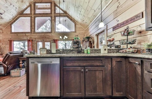 If someone in your party is handicapped or has trouble with stairs the main floor is on one level (including the deck, kitchen, dining room, living room, bedroom, bathroom with walk-in shower, 2 65" TVs, and two large fireplaces.) There are just 3 steps to access the home. The cabin has been lovingly appointed with elegant, rustic décor. Every piece of furniture was selected for comfort and style. Oversize windows bring in beautiful forest views and natural light.