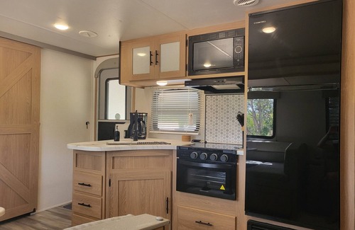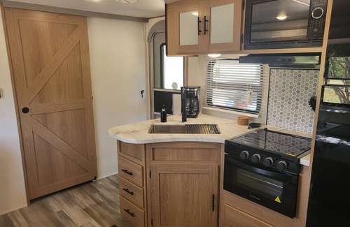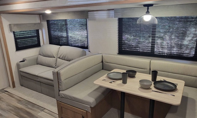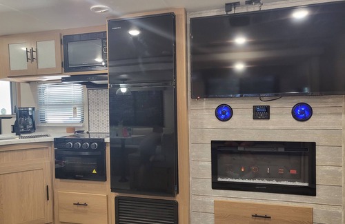 Perfect stay for game day! Go Aggies! This camper sleeps up to 10 people and has all the comforts of home. The 16' awning outdoors makes for plenty of shaded space while hanging outside. A fan favorite is the outdoor kitchen that includes a sink, cooktop, and mini fridge. There is also an outdoor shower. The indoor kitchen is fully stocked with everything you need to cook your meals. Cozy up on cold evenings in front of the fireplace while watching your favorite show on the flat screen TV.