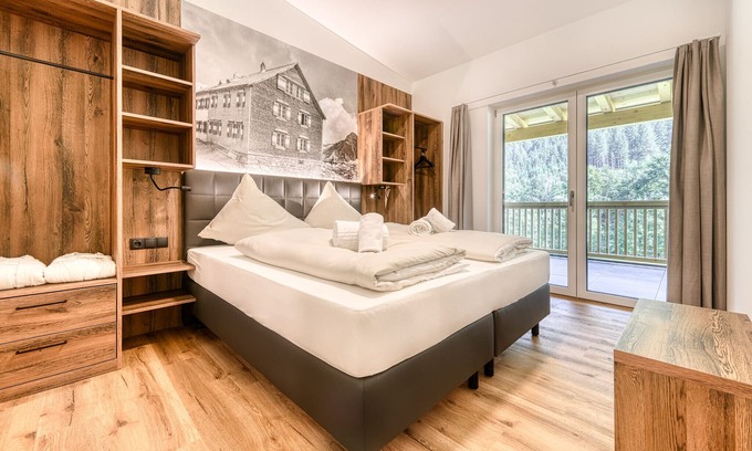Sit back and relax in this tranquil, stylish space.FURNISHING:When it comes to the holiday apartments, the name says it all, as local materials such as wood and stone were used in the construction. The owners grew up in Brand and parts of their families still live in Brand. The tourist operator also grew up in Brand and knows the valley like the back of his hand. A Brandner service, i.e. warm, genuine hospitality, can be felt.Our modern and functionally furnished holiday apartment in Alpine style can accommodate up to 8 people. Each bedroom with a double bed has its own bathroom, the kitchen is fully equipped and, depending on its size, offers enough space to end an eventful day at the cozy dining table. The balcony offers a beautiful, unobstructed view of the Brandner mountain panorama and invites you to have a drink. In the cozy seating area you can put your feet up with an exciting book.Particularly noteworthy is the wellness area on the ground floor. It offers everything a pampered wellness heart desires. A Finnish sauna, an infrared cabin and a steam bath are the classic treatments at the Brandnerhus. A spacious, bright relaxation room with access to the outdoors offers cozy moments between the various wellness sessions. A water fountain refreshes the mind and soul with fresh, cold Brandner spring water. This water is untreated and without any additives. It is almost detoxifying - so the best quality “Made in Brand”. Massages are available upon request.The in-house drying room for ski and outdoor clothing also offers a boot dryer and boot warmer for free use. There is also a ski and bicycle room for you to optimally store your sports equipment.VICINITY :The holiday resort of Brand is a unique all-season holiday destination. There are countless leisure opportunities in every season:In summer there is an extensive hiking network with hikes of all levels of difficulty. Mountain peaks with breathtaking views give you a special kind of alpine experience.An 18-hole golf course, 2 riding stables, an archery course, free outdoor sand tennis courts, indoor tennis courts, a free swimming lake, a climbing garden for young and old, guided hikes, the first and sometimes only bike park in Vorarlberg with fun sports equipment, countless alps and refuges, the Lünersee, which is under nature and landscape protection, and much more.In winter, Brand offers everything a modern winter sports resort has to offer: a family-friendly ski area with slopes of all levels of difficulty, cross-country ski trails, toboggan runs, winter hiking trails, ski schools, sports schools, a varied leisure program, an ice skating rink,...Wonderfully relaxing walks, lots of peace and a high relaxation factor characterize spring and late autumn.Numerous restaurants - stand-alone and in the various hotels -, shops and wellness options are open to our guests all year round. A special feature of this accommodation is the restaurant Gufer 55, which is located in the same building - a good home-style restaurant that has been awarded two toques and has no pretensions and a very good price/performance ratio.Located at the valley station of the Palüdbahn (50 meters), a ski-in is almost guaranteed, because the Palüdbahn valley run is not only known to the locals as the most beautiful and varied run in the Brandnertal, this red piste is also the snowiest valley run in the entire Brandnertal.“Feel the mountains” is our promise!