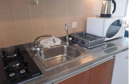 Kitchenette with stove, fridge and micro wave