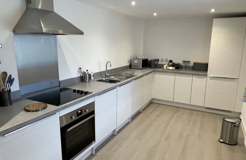 Set over two floors, this bright and modern place has two bedrooms with comfortable beds, two bathrooms, a fully-equipped kitchen, dining room and large lounge area.