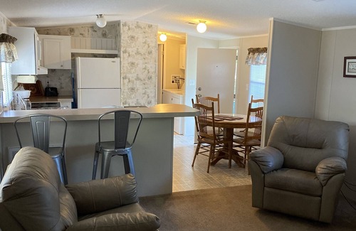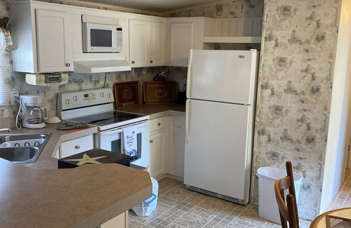 This 2 bedroom 1.5 bath that sleeps 4 is very a clean mobile home Perfect for a family of 4. It has 1 full size in master bedroom and 1 fullsize bed in guest room. Hide-a-bed in livingAll linens are included. Kitchen is fully stocked with all your cooking utensils as well as pots , pans, coffee pot , plates and silverware. Bring your bicycles or golf cart and enjoy Old Florida at its best.