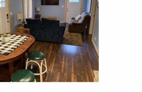 Our cabin offers a queen size bed in one bedroom and full sized bunk beds in the other. Although small, at just 715 square feet, you’ll have enough space to get comfortable and unwind after a fun-filled day outside. We have plenty of yard space to enjoy outdoor games and a lovely deck to read a book, have a drink, or simply relax. We have electric baseboard heating units in each room as well as a mini-split unit that offers additional heat or air conditioning so you are sure to be comfortable any time of year.