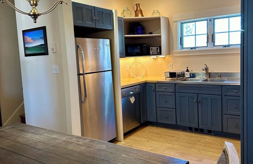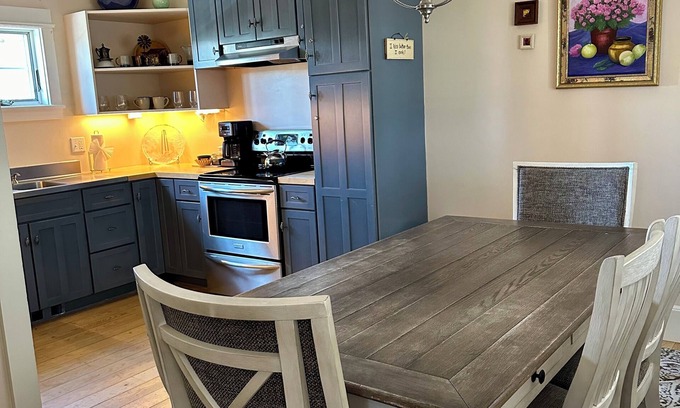 The Pine House is the two story house at the back of Westcliffe Suites facing 5th Street. Guests will walk into the kitchen and dining area then the pine wood stairs take you up to the sitting area, bedrooms and bathrooms.