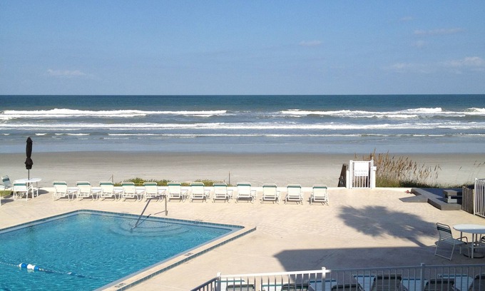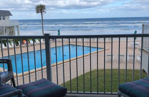 Our area of New Smyrna Beach is home to several well~known, MUST TRY, fresh seafood restaurants! And, some fresh seafood markets too if you're a DIY guest in the unit. Long walks, surf board and the paddle board rentals are close by, along with kayaks, bikes and more! Quaint shops along Flagler Avenue will keep the ladies happy, and a stroll along the oceanfront or a seat in one of several direct oceanfront restaurants also offers a great outing. Check us out! Great pictures of exactly what you see inside and outside our unit. Ready to welcome you NOW! Close set, direct oceanfront, 2 Bedroom, 2 Bath condominium overlooking pool also. This beautifully decorated, non-smoking unit has a breath taking, direct oceanfront view you will LOVE!!!! Tennis, pickleball, shuffleboard, nice and friendly complex and we are NOT a high rise. Avoid the crowds and feel relaxed here!