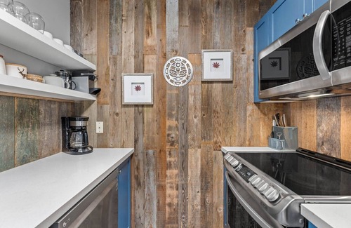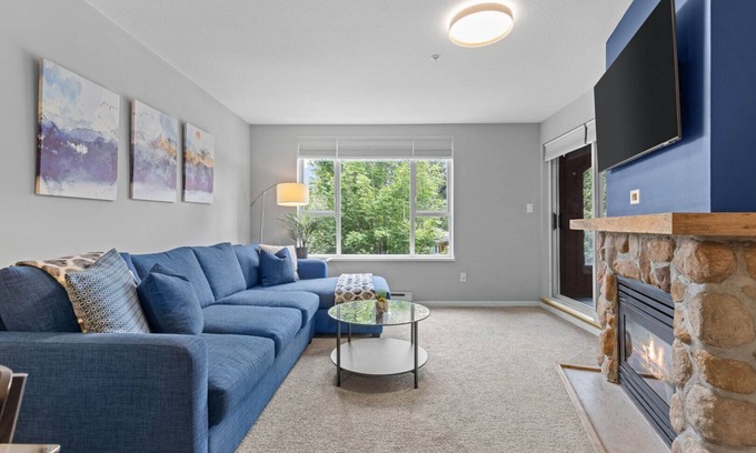 Inside, this newly renovated unit welcomes you with a warm, open-concept living area featuring a cozy fireplace, smart TV, and a large sectional couch, perfect for relaxing after a day of skiing, biking, or hiking. The well equipped kitchen comes with sleek stainless steel appliances and everything you need to cook up anything from quick breakfasts to gourmet dinners. Two spacious bedrooms plus two full bathrooms offer plenty of comfort and privacy. Step outside to your private undercover patio—the perfect spot to sip your morning coffee or unwind with evening drinks in the fresh mountain air, rain or shine.
