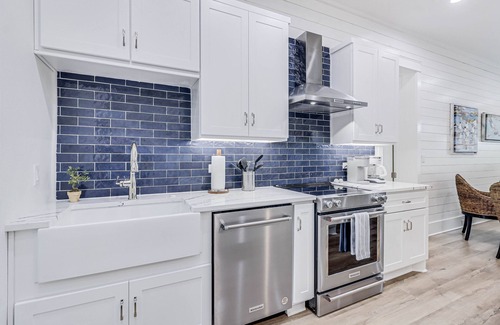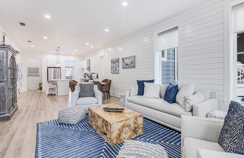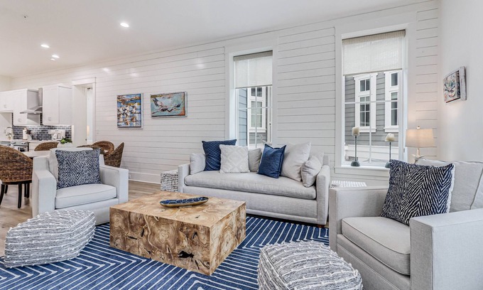 MAIN LIVING SPACE: Gather in a gracious, open-concept space, where comfortable den flows to dining area and well-equipped kitchen. Dine or play games on the round table for six, where chairs made of woven natural fiber fit into the island aesthetic. Seat four more guests at the kitchen island for easy breakfast or lunches, and enjoy using the kitchen’s prep space and stainless appliances. A navy rug and blue tile backsplash accent the all-white walls, furnishings, and shiplap to create a space that’s unmistakably inspired by sea and sky. The entire room opens to a balcony with Town Center views for extended living space.
