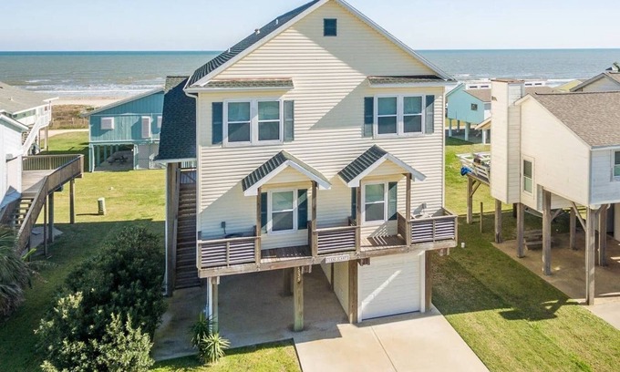 Beautiful two story 2nd row home is just steps from the sand and sea. Spanish Grant Subdivision is a short drive to the Seawall, Moody Gardens, Schlitterbhan, Strand, Pleasure Pier and many other Galveston favorites including restaurants.