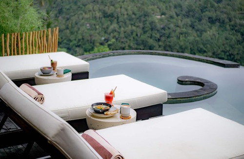 You will also have access to three lounge areas, a sunken couch area on the top level, a sunbathing platform on the middle level, and a large living room with a kitchen and sunbathing area connected to the large infinity pool overlooking the volcano and the rice terraces.