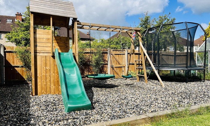 Just 30 minutes from central London attractions by tube, this attractive family home has three bedrooms and two bathrooms with fantastic south-facing garden and play area for the kids, and a raised decking area for enjoying al fresco meals. 5 minute walk to fantastic park and 5 minute drive to gorgeous Ruislip Woods and Ruislip Lido with endless options for walks. The high street of Ruislip Manor is 3 minutes walk away, with fantastic restaurants and pubs. Off road parking for 2 cars and 70 MBPS WIFI throughout the house (and in the garden). Smart TV with Disney+ and Prime. Main bedroom has king-sized bed with built-in wardrobes, shutters with blackout blinds, and ensuite bathroom (bath and shower). Second bedroom has single day bed that can be pulled out into a king size. Third bedroom/office has a double futon and a work station. All bedrooms have a fan. Downstairs living room has new L-shape sofa that seats 5 and a cosy love seat for 2. Everything described so far has been renovated in the last two years. The rest of the downstairs (kitchen, family bathroom and dining room) retains its classic 1970s charm as can be seen in the photos. Dining room opens onto wooden decking above the garden, perfect for summer meals and watching the kids play in the garden. Garden features 7m trampoline (new safety netting installed June 2023) and climbing frame with swings, a slide, monkey bars and pirate tower in play area with soft rubber chipping underfoot. Closest tube is Ruislip Manor (Piccadilly and Metropolitan lines) which is 500 meters/7 minute walk away and Ruislip Gardens (Central line) is 1km/18 minute walk away.