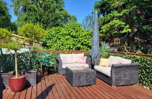 - Private garden with large deck, BBQ, loungers, and fish pond