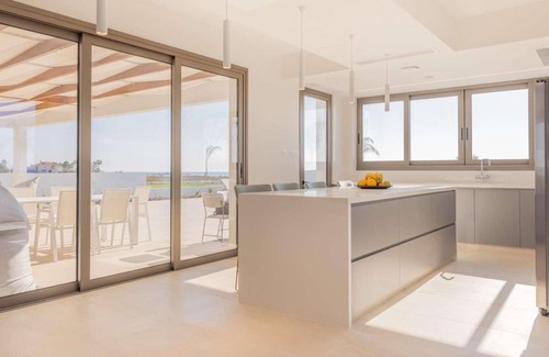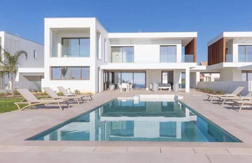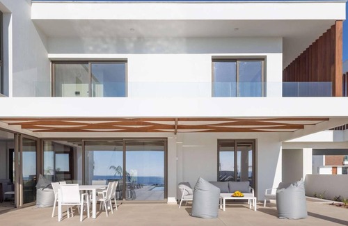 Brand new 3 bedroom villa, situated on a exclusive gated conclave, with stunning seas views and only minutes from the coastline. The interiors are sleek and contemporary and finished to high standard. The open plan ground floor has a modern lounge with sliding doors to the pool area, making the room light and airy, the kitchen has all the modern appliances as well as a breakfast bar and you will find dining facilities to entertain your family and friends. on the first floor you will find the 3 bedrooms 2 doubles and a twin all enjoying their own shower room, all have a balcony and a TV. As you head outside the area does not disappoint, with fabulous sea views and your own pool so you can make the most of the Cypriot sunshine. Al fresco dining is the order of the day, under the shaded terrace, why not pop on a few sausages and halloumi on the BBQ as you take in the vista. If you want to work off your lunch there is a gym on the lower level as well as a sauna and shower room. The surrounding countryside is flat and open, unspoilt with fields and orchards all around and a lovely peaceful ambience perfect for unwinding. The charming village of Kiti is nearby, with plenty of restaurants and traditional tavernas to choose from in the square. You can really get a feel for traditional Cyprus here and it is a great place to explore what the rest of the island has to offer. The sea in front of the villa can have strong under currents, so whilst it is beautiful to look at, please use Careta bay beach just a 20 minute walk away for swimming. All bedroom and bathroom linen is included. Bath towels are also provided. This property comes with Free Wi-Fi, Free Air Conditioning, Free Cots, Free Highchairs.
