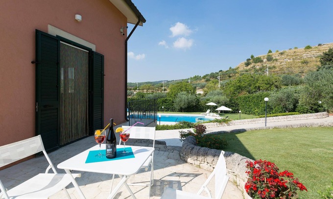 A few dozen kilometers from the historic center of the baroque town of Ragusa Ibla, on the road that connects Ragusa Ibla and Giarratana, and adjacent to the forest reserve "Calaforno", lies this beautiful independent vacation home with pool with Jacuzzi corner. The house is framed by an area of about 2000 meters of lawn, crossed by white stone paths, while a large terrace overlooks the plateaus covered with pines and conifers. On the adjacent property are olive trees, the homeowner produces a very high quality organic olive oil. The pool area with the surrounding lawn, sun loungers and deck chairs invites you to relax.