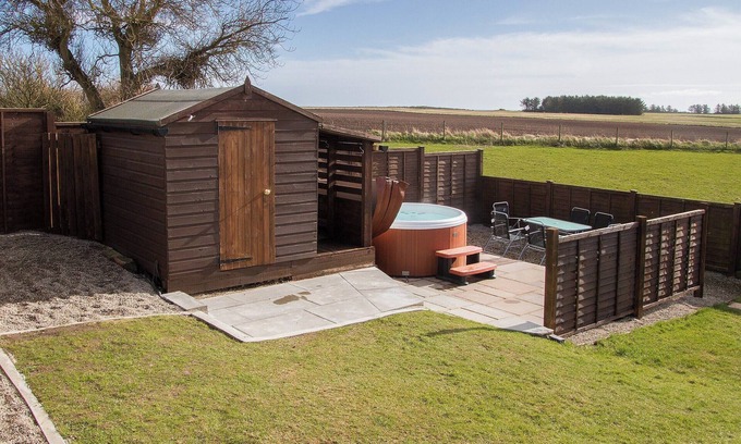 Bathroom: Bath, Cubicle Shower, Heated Towel Rail, Toilet. Electric central heating, electricity, bed linen, towels and Wi-Fi included. Welcome pack.. Enclosed garden with patio and garden furniture. Hot tub for 6 (private). 2 dogs welcome, to be kept on a lead at all times (working farm). Private parking for 2 cars and a trailer. No smoking. Please note: There are 2 steps in the garden.. Set in open countryside, above the charming seaside village of Portmahomack, Sheaf Dale is a beautifully presented cottage with a private hot tub in the gardens and a rear gated parking area, ideal for trailers with canoes, bicycles or other equipment. This single-storey, terraced, whitewashed stone cottage is tucked away along a quiet lane on the owner’s working arable and sheep farm. It has been painstakingly restored and renovated throughout and provides a good standard of accommodation in a peaceful yet accessible location. The large, airy living room looks out across the fields, and there is a spacious, well-equipped kitchen/dining room, with plenty of room for up to six guests. The master bedroom features a super kingsize bed and a wall-mounted TV, and both the double bedroom and the bunk bedroom are superbly presented with colour-coordinated soft furnishings. Exposed stone walls and large canvases of the local area add to the property’s charm. There is a secluded lawned garden with a sandstone patio area that leads down to the feature hot tub, making this an ideal property for couples, honeymooners and families wishing to have a relaxing, pampering holiday.