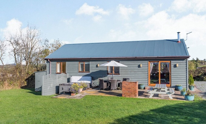 Separate Toilet.. Gas central heating, electricity, bed linen, towels and Wi-Fi included. Initial logs for wood burner included. Travel cot and highchair available on request. Welcome pack.. Enclosed, lawned garden with sitting-out area, garden furniture and football net. Hot tub for 6 (private). Bike store. Private parking for 2 cars. No smoking.. Cuckoo Hill Lodge is in the heart of Mid Wales, surrounded by rolling hills. The lodge is all on the ground floor and has an open plan living area with a wood burner and large TV, and a well equipped kitchen, three bedrooms and two bathrooms. In the private garden you can relax in a hot tub as you ease your walking muscles after a day exploring.