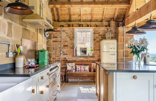 Bedroom 3: Kingsize (5ft) Bed. Underfloor central heating, electricity, bed linen, towels and Wi-Fi included. Initial fuel for wood burner included. Travel cot and highchair. Welcome pack. Sitting-out area and garden furniture. Bike store. Private parking for 3 cars. No smoking.. Tucked away on the edge of the picturesque village of Swainby, The Gin Gang is a stunningly restored old wheelhouse, now a luxurious and character-filled holiday home. This unique property has been thoughtfully reimagined to retain much of its original charm, with exposed stone walls, rustic beams, and soaring double-height ceilings creating a warm and welcoming atmosphere.