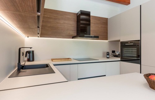 Experience a holiday at the highest level in this stylish holiday home in Tomazici. The modern interior combines elegant design with rustic charm, thanks to exposed wooden beams and high-quality materials. The light-flooded interiors offer you plenty of space to relax and enjoy yourself. Feel right at home here and enjoy your everyday holiday with your extended family or two family friends, as you will find everything you need to make it perfect.