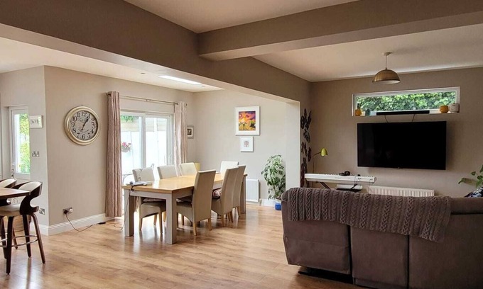 Located in Dublin, this house is a dream with lots of relaxing space inside and south-facing private garden where guests will instantly feel at ease. The property boasts 2 large living areas, 3 bedrooms, including 2 queen beds and 1 single bed and 3 bathrooms with all modern amenities included including WiFi, 60" TV, Netflix etc. Located close to Dublin's main airport, with easy access to the national highway network and to rail and other transport services, this home is the perfect place to base yourself if you want to explore Dublin or the surrounding countryside.