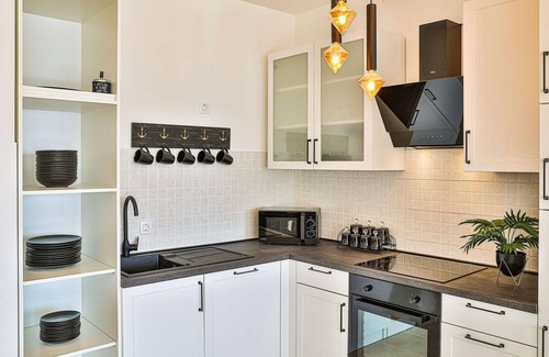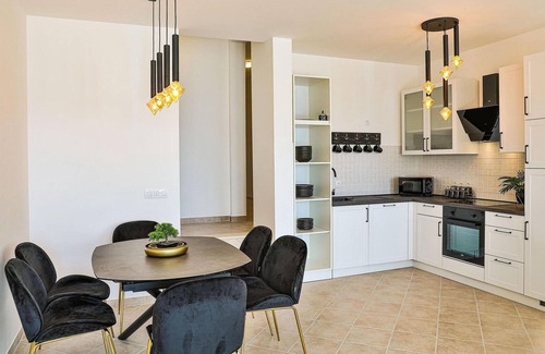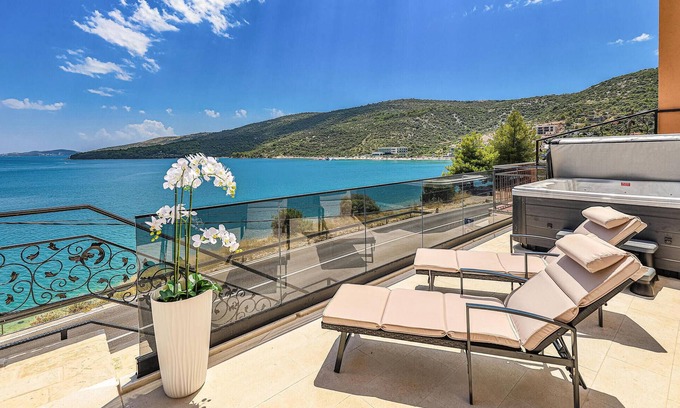 This large, modern holiday home is located near the beautiful town of Trogir, where you can have a wonderful time at any time of year. From the balcony you have a spectacular view over the strait and the harbour of Marina. Here you can breathe in the clear, fresh sea air in the early hours of the morning, giving you a fresh start to the day. It is probably even more beautiful in the evening, when the fishermen and sailors return from their excursions and the sun goes down. Sit cosily on the couch with your loved ones and enjoy the view. On hot days, you can jump straight into the sea. Due to the high salt content in the region, you can almost glide in the sea.