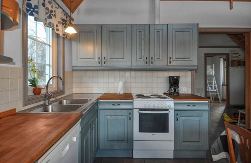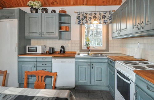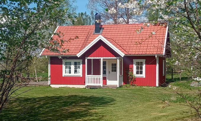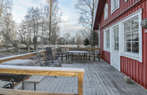 This holiday home offers a wonderful retreat for nature lovers at any time of year. Spend a relaxing holiday in this charming holiday home near Lilla Mosstorp. Surrounded by idyllic countryside, the house combines traditional Swedish architecture with modern amenities. The spacious living room invites you to linger with its comfortable seating and rustic wood-burning stove. The warm wooden elements and natural furnishings create a cosy, feel-good atmosphere. The large dining table provides space for family and friends to enjoy meals together and round off the day.