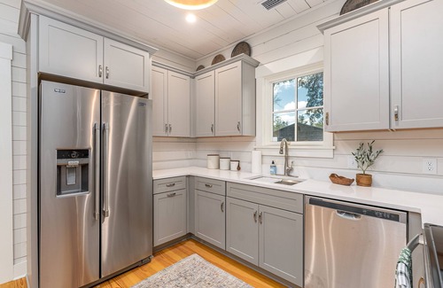 Enjoy this historically-styled accommodation with modern amenities and appliances! Each bedroom has an en-suite bathroom, with 2 bedrooms on one side and another bedroom/bathroom and kitchen + living room on the opposite. The kitchen is fully stocked with everything you need to enjoy your time on the marsh.