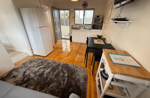 Open plan kitchenette, dining/living area with fridge/freezer, microwave, large air fryer/oven (no oven/stovetop), toaster, kettle, toastie machine, electric frypan, pantry cupboard, glad wrap, alfoil, bin liners, dining table/4 chairs, TV - non smart and DVD player, split system reverse cycle air-conditioner, 3 seater lounge. small selection of dvd's and games.