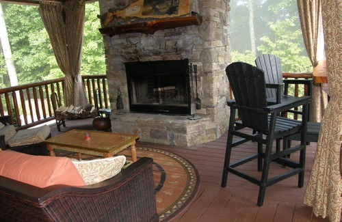 Eagles Rest is a Magnificent Large Cabin High atop Godfrey Mountain with 270-degree seasonal views of the Blue Ridge Mountains and Apple orchards below. Take in gorgeous sunrises from the wrap-around decks with an outdoor fireplace, furnished with deep seating conversation group, glider, Adirondack chairs, rockers and a picnic table. Gates on the deck protect pets and children.